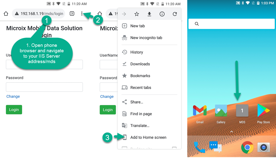 Follow the steps below to create a shortcut to the MDS app on your barcode device (DT50) and or tablet (Android/iPhone OS). It is recommended to save the User Name and Password for easier access when prompted by the mobile browser during