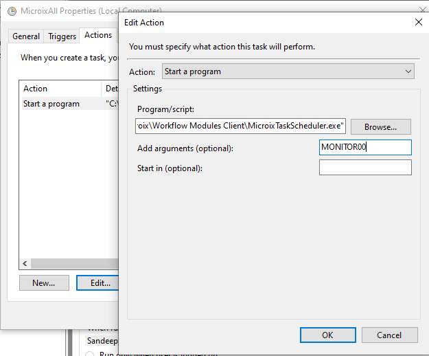 Step 13: On the Action Tab select “MicroixTaskScheduler.exe” which is located under “C:\Program Files\Microix\Workflow Modules Client\".