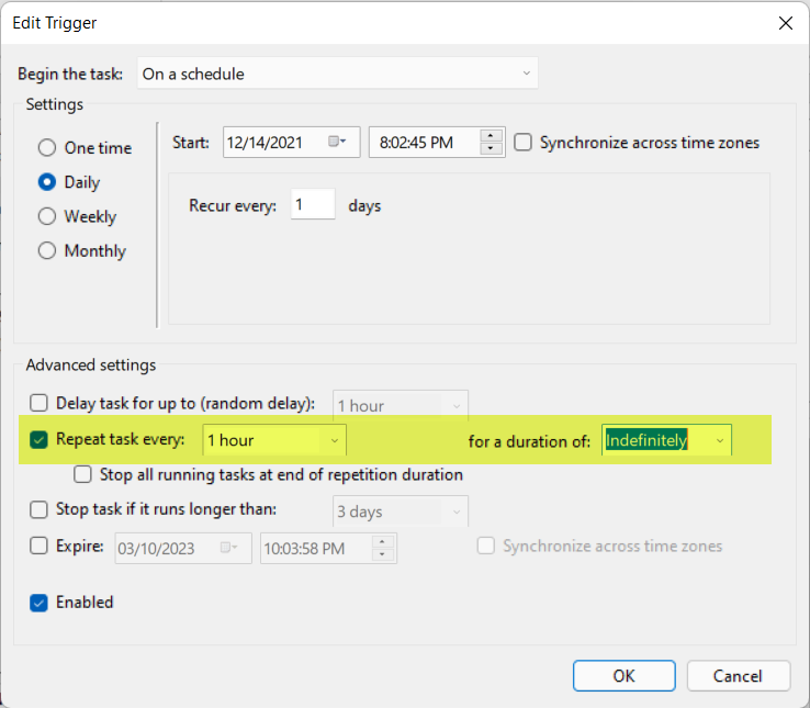 Step 12: On the Triggers tab set the scheduler to run once a Day.