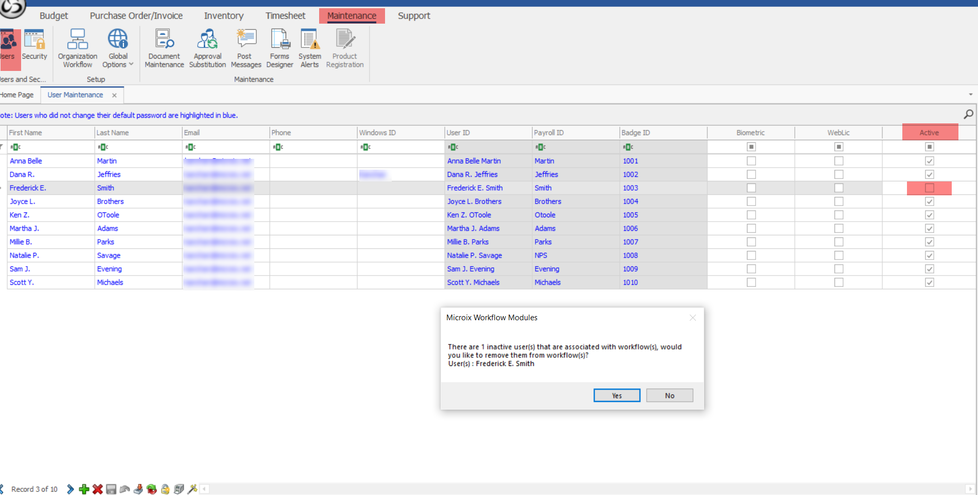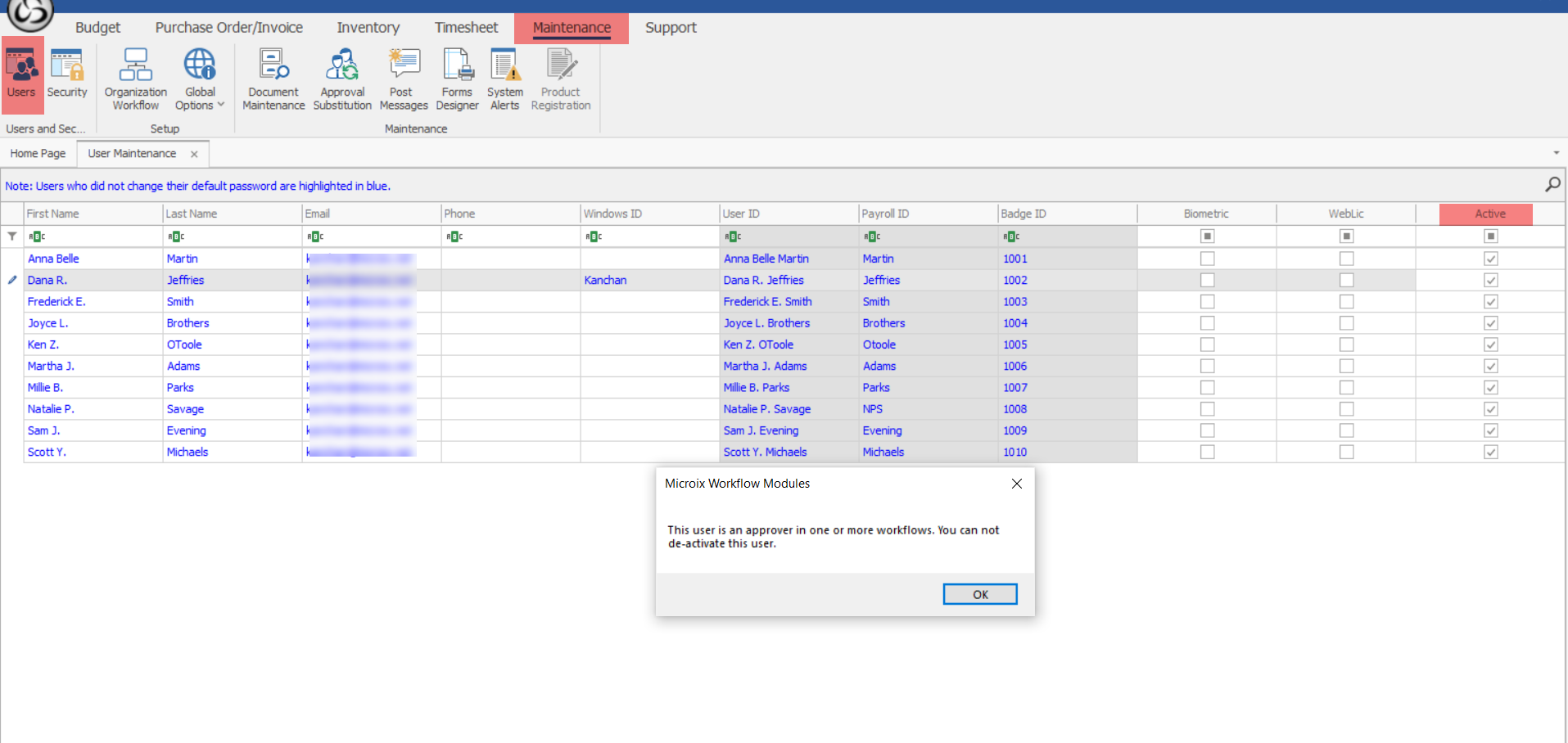 Step 2. If the user is an Approver in workflow , it will then give a prompt - "The user is an approver in one or more workflows. You cannot de-activate the user. - For this, you would first need to remove the user as an approver manually from the workflow either by replacing them with another approver or deleting their approval level if not required. Once you remove the user as an approver then come back to Maintenance - Users - Uncheck the Active box - and follow the step 1