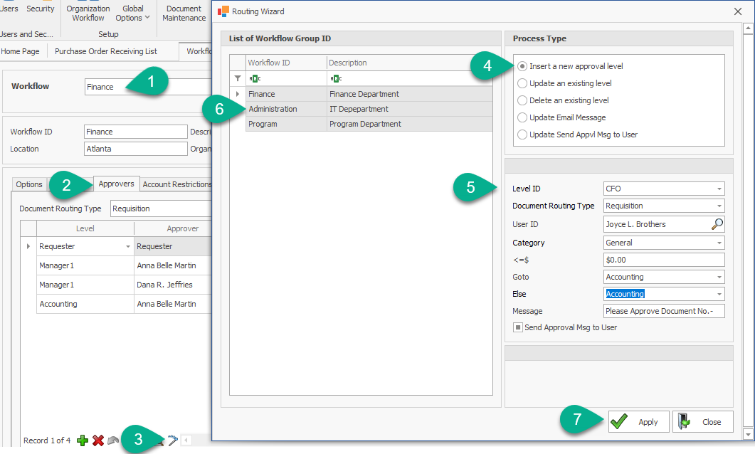 NOTE: The following instructions are to demonstrate how to add a new approval level “CFO” to all selected workflows when a purchase order requires CFO approval equal or above $10,000.