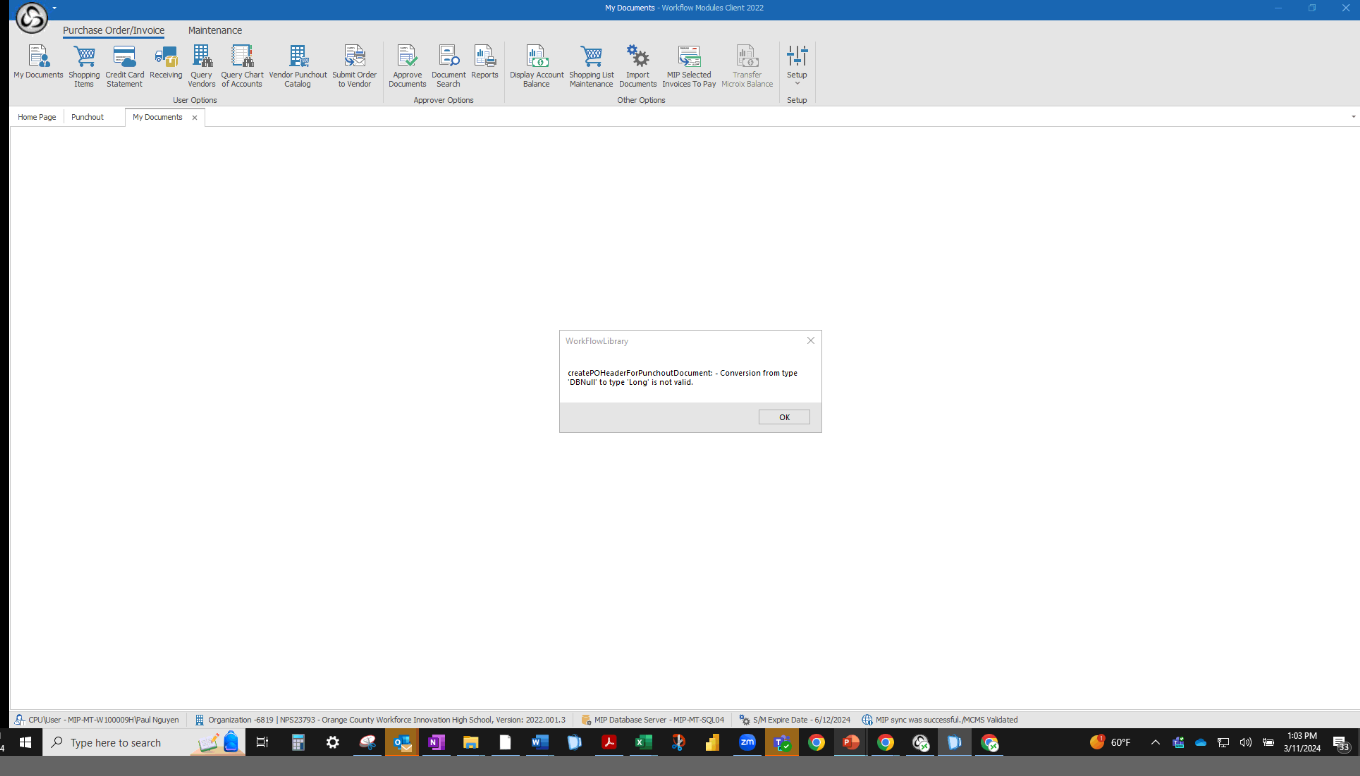Issue -Unable to open My documents to view the vendor punchout document as it gives an error -