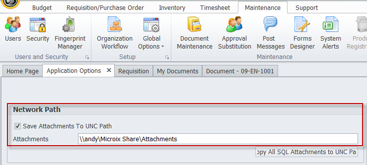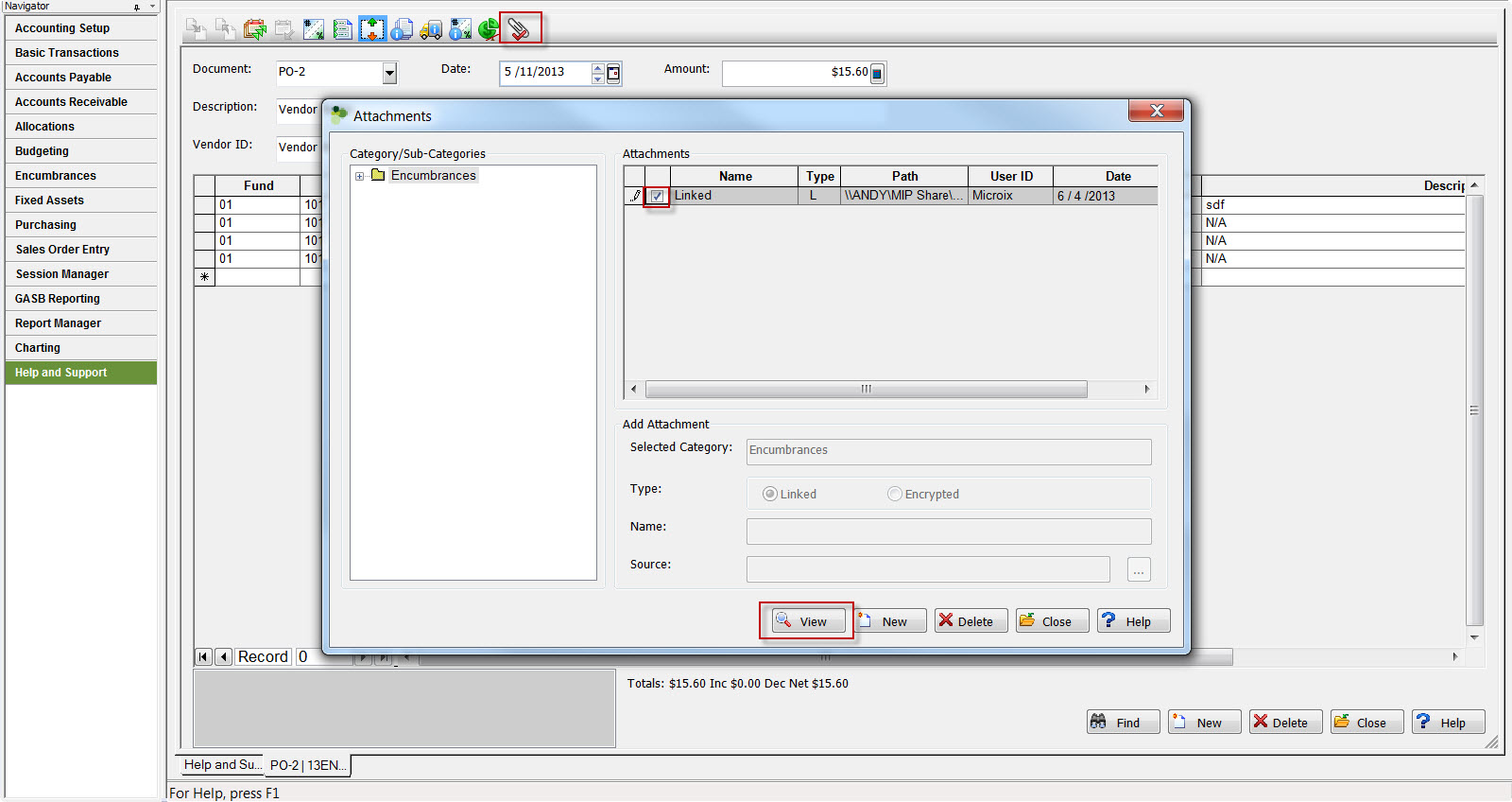 "Enable Attachments" should be checked and verify a valid UNC Path is specified for Encumbrance and Accounts Payable. If you get error while saving Attachment location page you may also have to correct UNC Path for other module as well and read/write permission should be granted for the windows account.