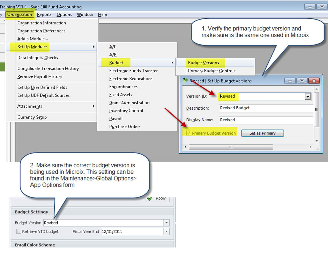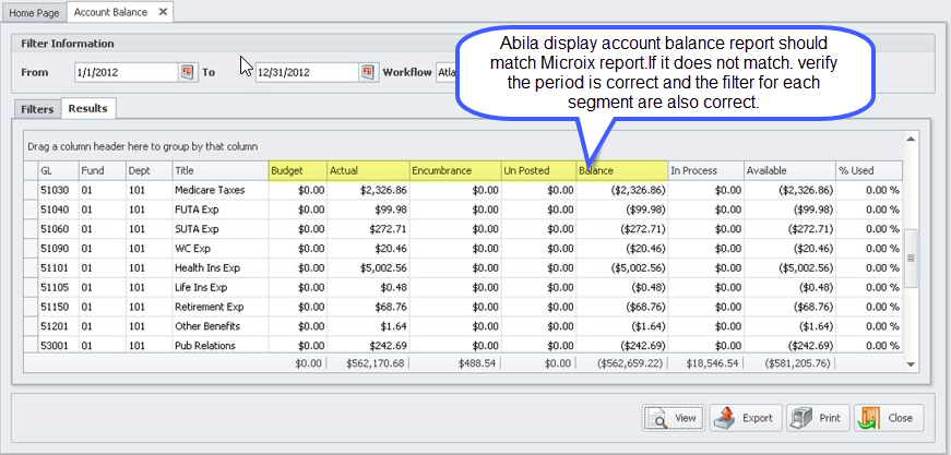 Step 4: If you get incorrect results from the Abila Available Budget Balance then you may contact Abila Support for assistance. If Abila reports displays the correct values and Microix does not, please forward the screen shots of your settings and reports to