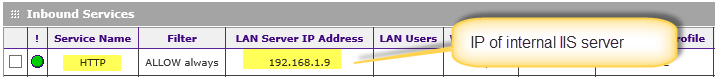 Our support department will not assist with this option as it requires knowledge of specify hardware and domain providers. We suggest speaking with your router support rep and also your domain hosting company to create a sub-domain for access to your Microix Cloud/HTML Application. Here is an example of a NetGear ProSafe Business Router and Goddady sub domain setup. Step 1. Change/modify your internal firewall (router) inbound services to allow HTTP request to your local IIS server (internal IP address of IIS Server).