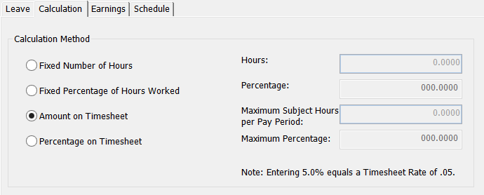 4. Setup the leave code calculation accrual method as “Amount on Timesheet"