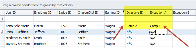 7. Finally setup the employee default values for overtime rule. Make sure the place the Comp 2 code in the Overtime ID and the Comp 1 code in the Exception A column. Assign to all employees who will follow the same rules