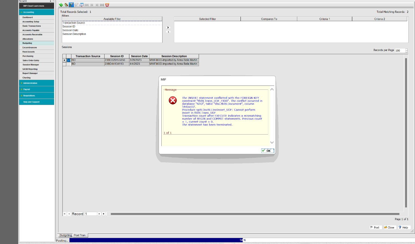 Issue: "ADO Error" while posting Budget Documents in MIP.