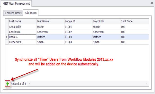 How to add new Employees (MBIT User Management):Step 1: Select Time Clock ID from "Enrolled Users" Tab - Go to Add Users Tab and follow the stpes below to Add “Time” users from Workflow Modules 2015.xx.xx