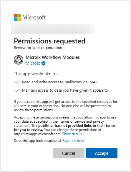 - The system will open a Microsoft login page where the Office 365 administrator will be prompted to authenticate to grant Microix Workflow Modules Application Read/Write to a mailbox account that will be setup in the next step.
