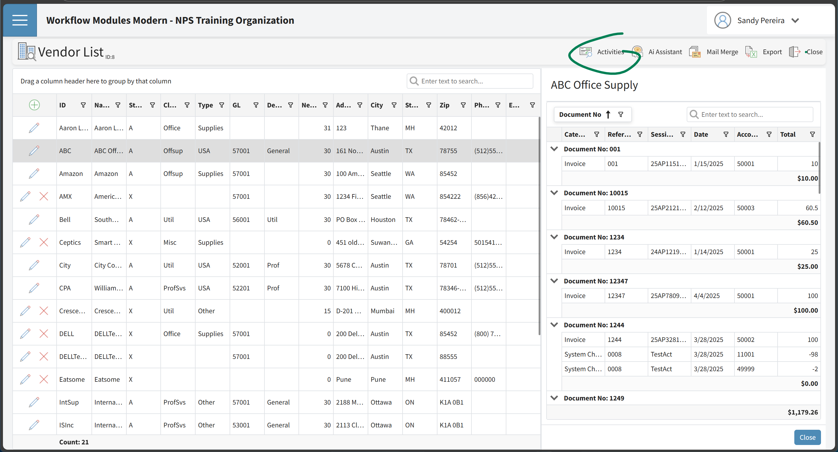 Use the Activities button to search for invoices and payments related to specific vendors.