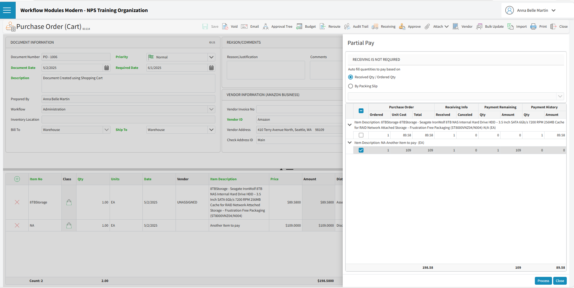 Only approvers whose workflow has both Go To and Else levels set to Level 12 – Documents Approved can create partial payments.