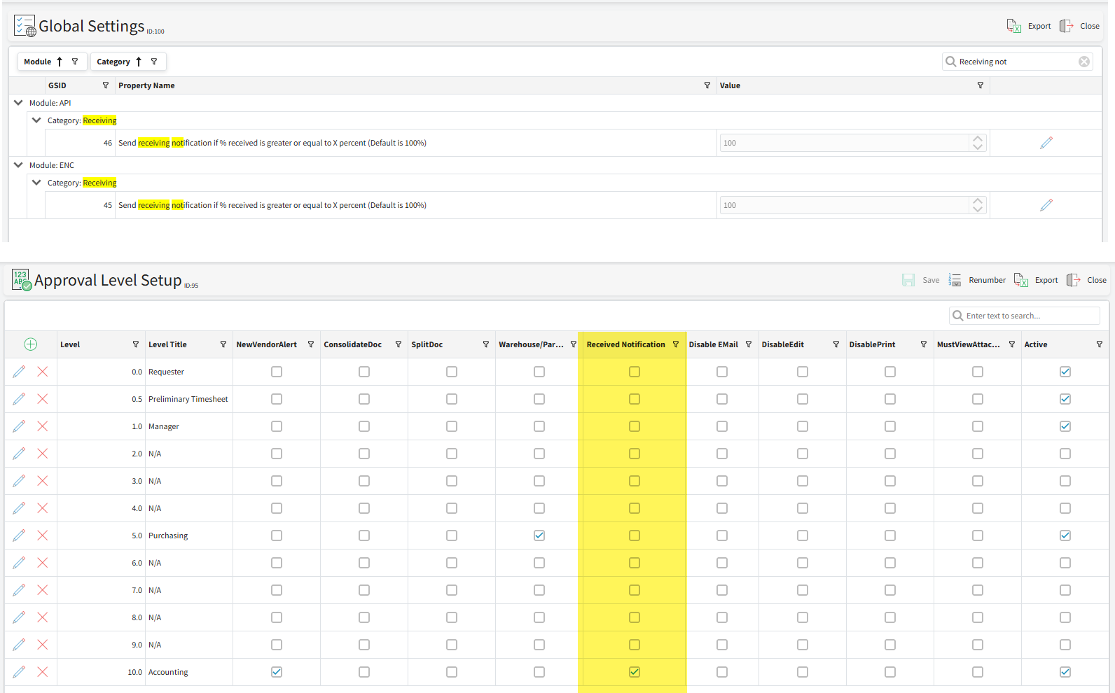 Microix includes a Receiving Notification feature designed to alert specific approval levels when items have been received against a Purchase Order (ENC) or Invoice (API). This is especially useful for Accounting or Accounts Payable (AP) staff who need to know when goods or services have been received before processing vendor payments.
