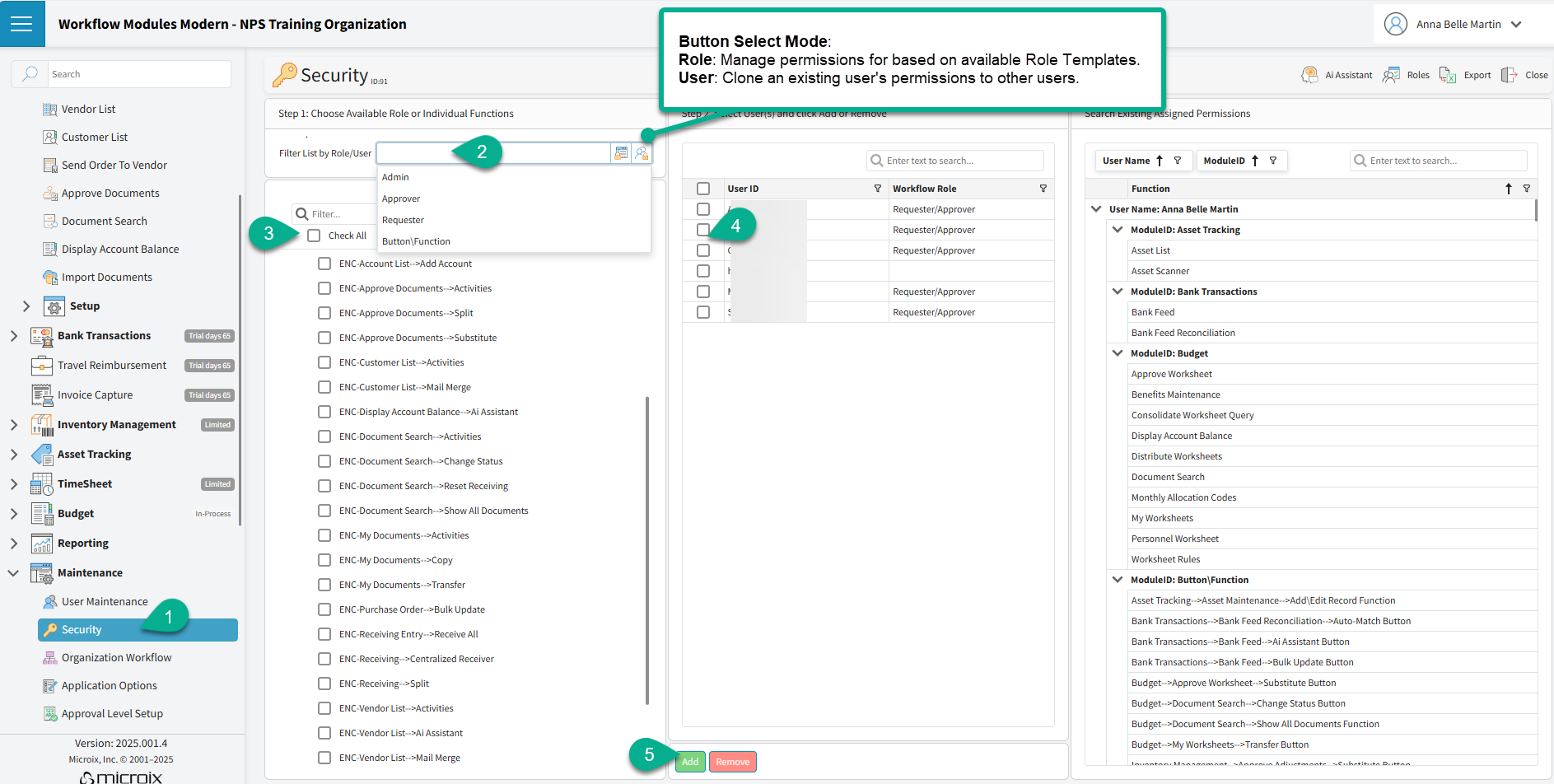 Do not grant Button/Function permissions to all users. These permissions should be limited to a small group of Microix Users or other authorized personnel.