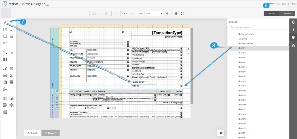 Preview or print the document and verify that the newly added field (such as the UDF label/value) appears in the correct location on the output.