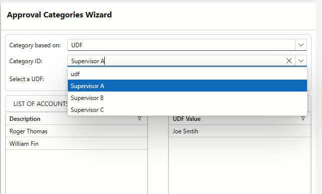 You can only create one Category ID at a time. Enter the first Category ID (e.g., Supervisor A), then select the corresponding person from the available list.