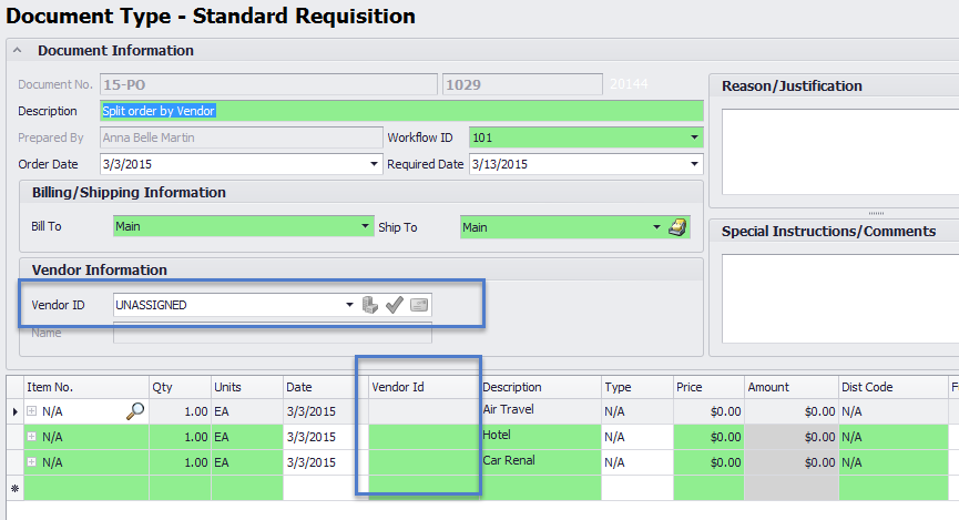 2. Create requisition with vendor “Unassigned” and line item vendor with a blank value. Submit for approval until it arrives at the approval leave