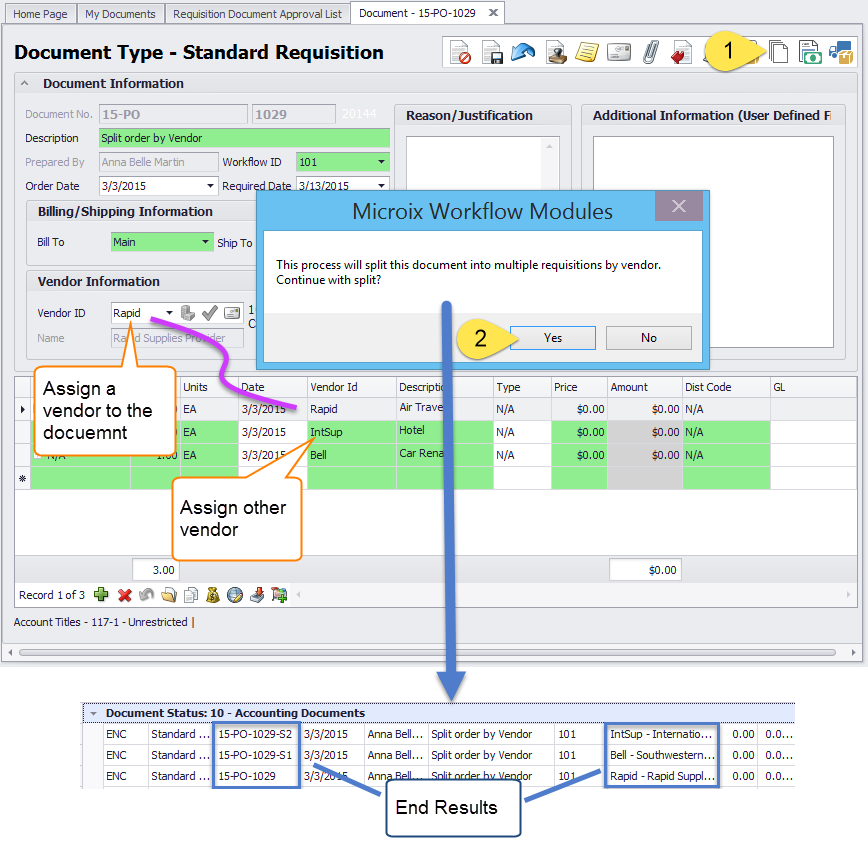 3. Assign vendor for each line on the PO and use the split (1) icon to create multiple purchase orders by vendor.