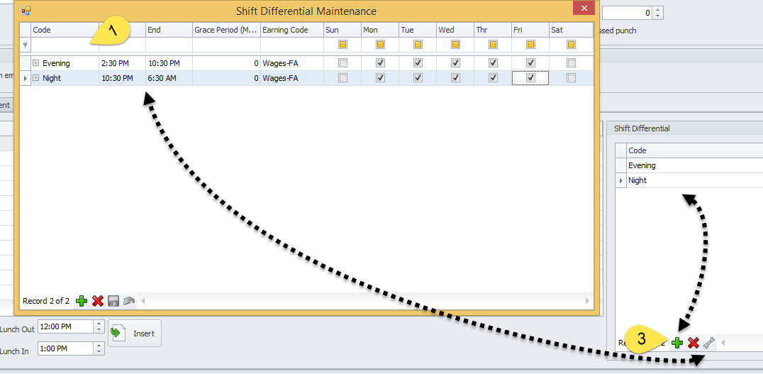 3. To create the shift rules in Microix, navigate to Timesheet>Setup>Shift Codes. Select the wrench icon to open the Shift Differential Maintenance screen and add the evening and night shift rules based on the required period of time and day of week. Once completed, add the rules to the shift code by using the green plus icon to any shift code that requires calculation of shift differential pay. Additionally, assign the employees to the correct shift code via the Timesheet>Setup>Employee Default Value form.