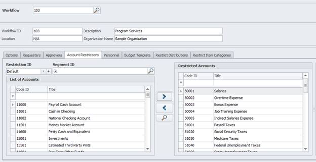 1. You must first have GL restrictions set up for the workflow under Maintenance > Organization Workflow > Account Restrictions.