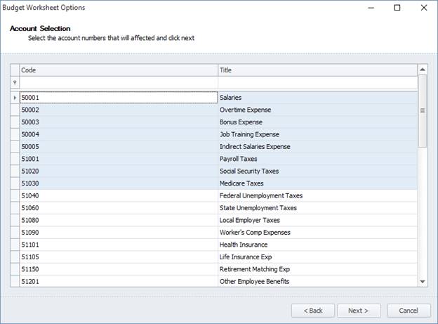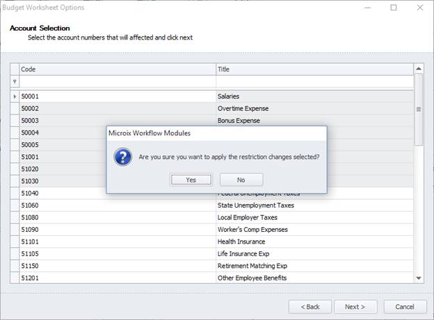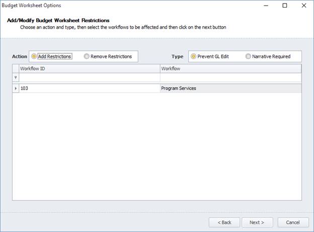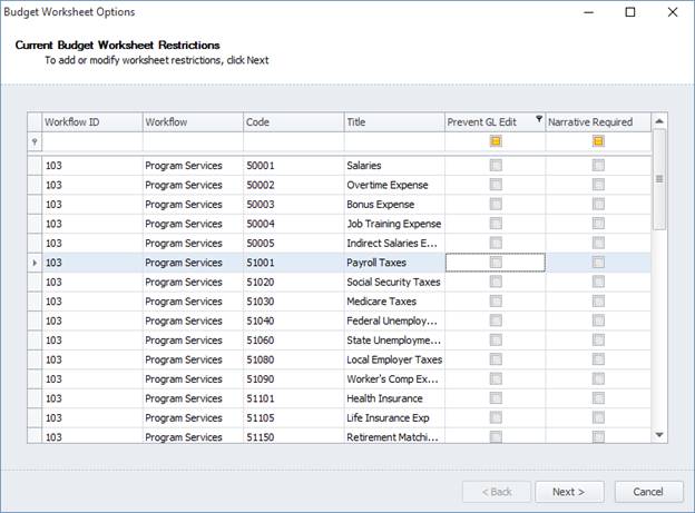 Budget worksheet options provides a wizard like interface to select and apply either “Require Narratives” or “Prevent GL Edit” options on a GL by GL basis. While the steps are logical, you will need to create account restrictions for GL accounts in your workflow first. (NOTE: any GL that is restricted from being edited will also not show the narratives. This is not true for approvers, they will continue to have the ability to edit budget and see the narratives.)