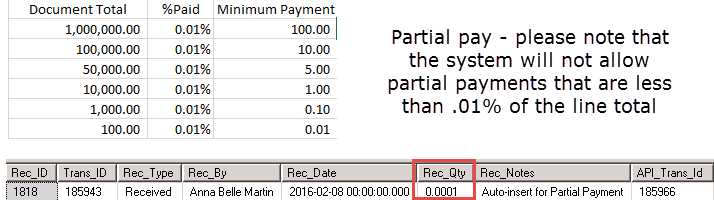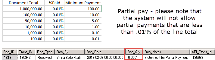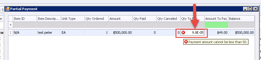 Solution: With .9 version, the system will no longer accept partial payments that are less than .01% of the line amount.