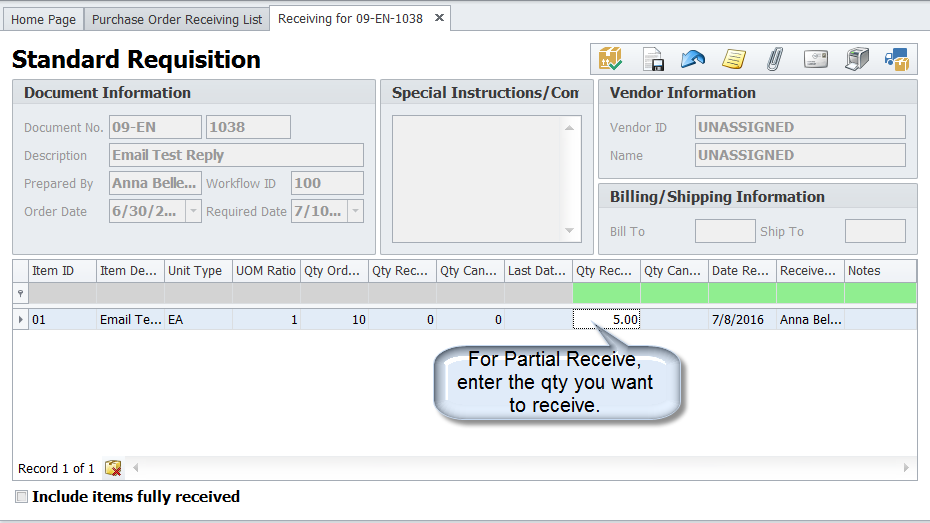 Receiving function notifies the system that the items in a purchase requisition have
