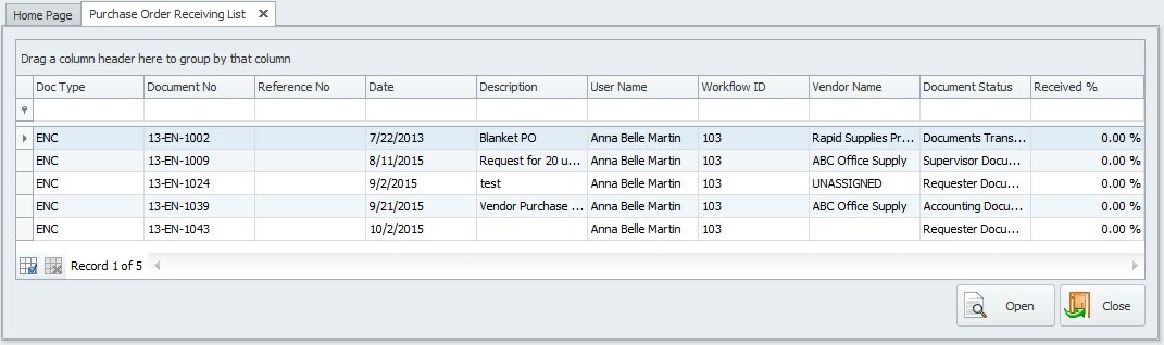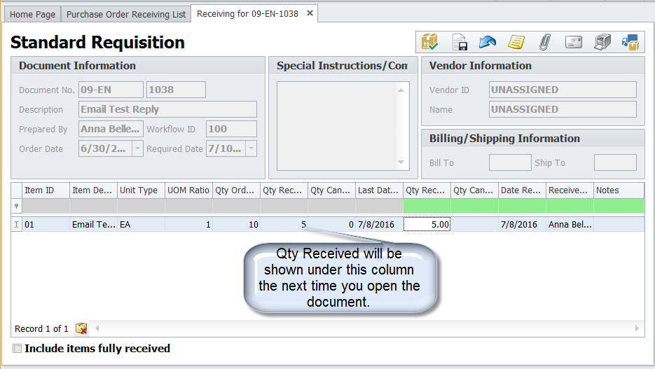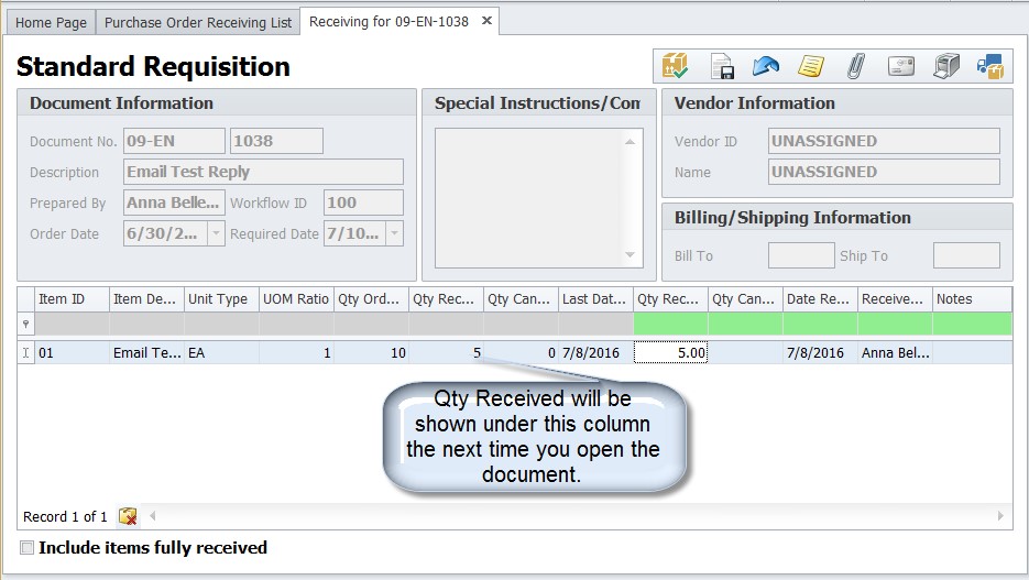 Once the document is fully received, it will disappear from the Receiving List.