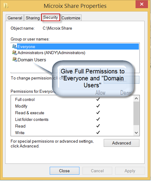 Microix will failed to back up the database if you have a permission issues. We recommend to give "Everyone" and Domain users" full permission to your Microix Share Folder under "Share" and "Security" tab.