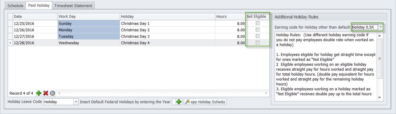 Setup for employees not eligible for holiday pay but if they work on a holiday then they get double time (2.0 Rate)