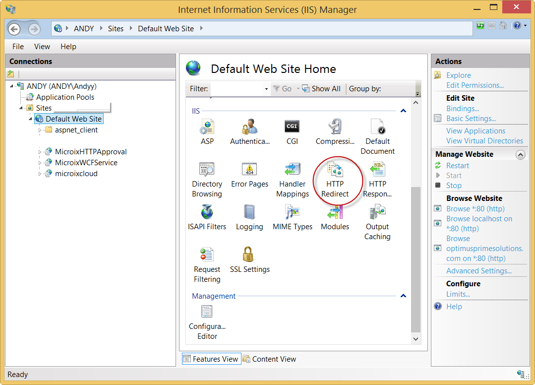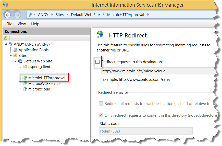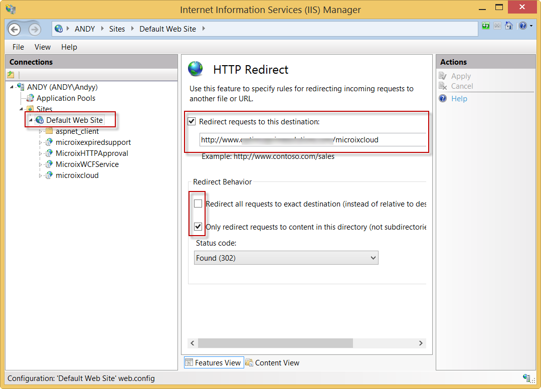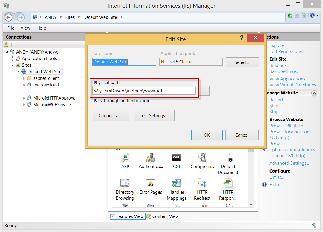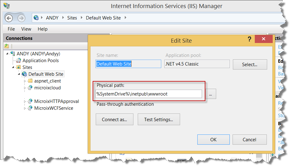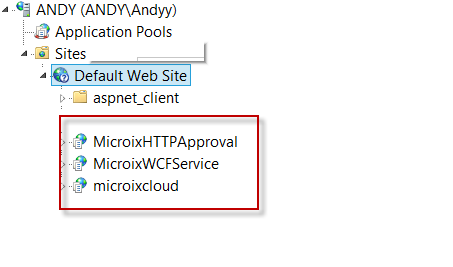 Note: If Microix Cloud application is added directly to default website and default website is also configured with other applications like HTTPApproval or WCF Serivce, these applications will not work as they all will try to find webconfig file loaded under Default website and will error out. Step 1: Create Microix Cloud and all other Application under Default Web site.
