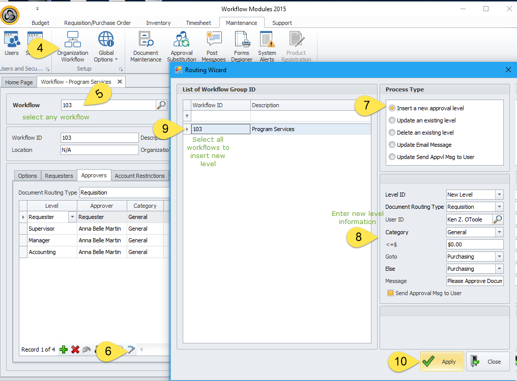 2. Insert the new approval level to each workflow. A manual adjustment may be necessary to each workflow to modify routing of exiting levels to the new approval level or use the “Update existing level” option in the routing wizard to update existing level if applicable.
