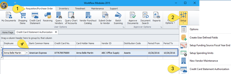 1. Navigate to Requisition>Setup>Credit Card Statement Authorization and enter each credit card user.