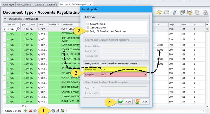 3. After creating the Invoice, navigate to Requisitions>My Document to find the newly created invoice in the list. Edit the document and you will see all entries from the statement are now visible including the expense coding except for GL. Click on the “Global Update’ button to assist with ‘Assigning GL Based on Item Description”. (Example: Search for words beginning with “DOL” and set the GL to 60001 or search for all transaction lines beginning with “WAL-MART” and assign GL to 50001. Upon creating your next month’s statement, Microix will automatically try to populate your GL account based on how you coded the prior months statements.
