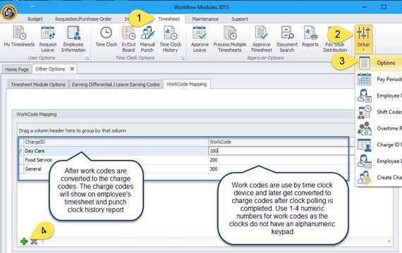 1. To start the process, login to Workflow Module Client application and navigate to Timesheet>Options>WorkCode tab. Enter all work coders to later upload to all clocks and used by employees during the clock IN process. Keep the work codes between 1-4 characters for easy data entry. NOTE: You will not be able to associate the work codes to specific employees, all users of the clock will see the entire list of work codes.
