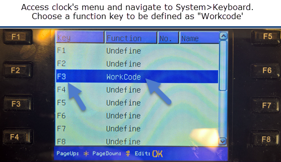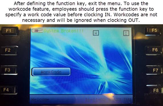3. Finally, activate the Work Code feature of the clock by following the steps below. If your clock is configured to not press IN or OUT (verify mode) then users should only use Work Codes as needed and only on IN type punch. They do not have to specify a work code on an OUT punch. If employees do not enter a work code, the system will use their default charge code that is setup in Workflow Modules.