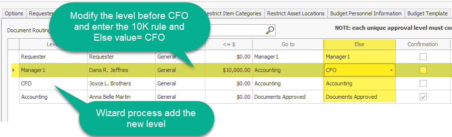 NOTE: The following instructions are to demonstrate how to add a new approval level “CFO” to all selected workflows when a purchase order requires CFO approval equal or above $10,000.