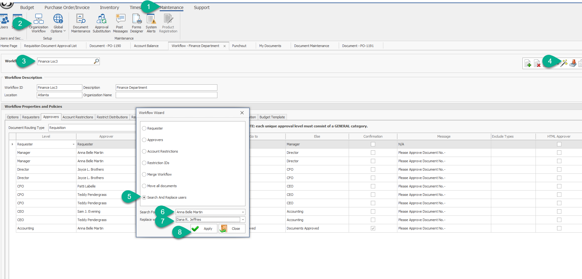 Below are the steps to replace a user across all workflows by using the workflow wizard.