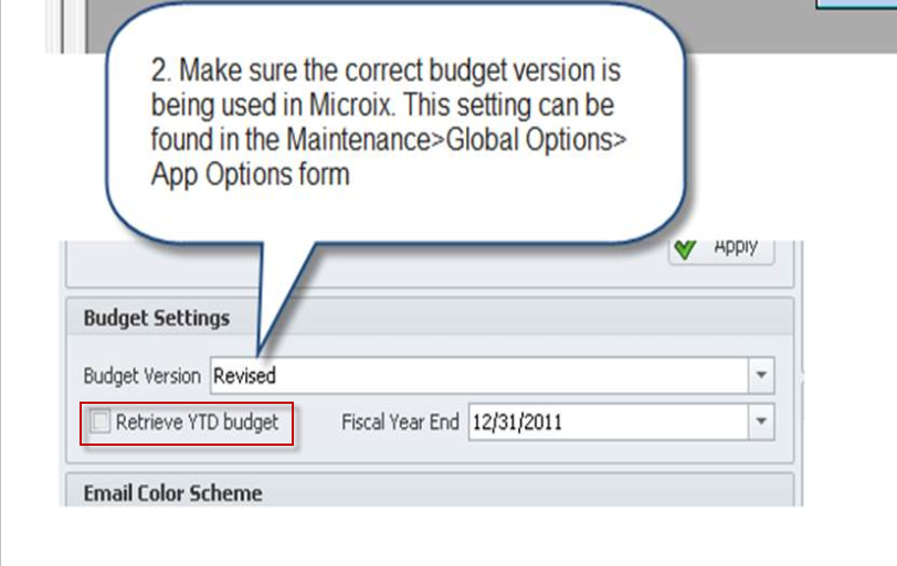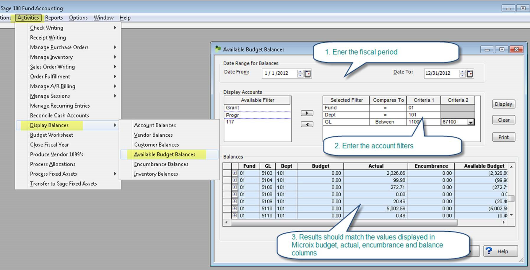 Step 4: If you get incorrect results from the Abila Available Budget Balance then you may contact Abila Support for assistance. If Abila reports displays the correct values and Microix does not, please forward the screen shots of your settings and reports to