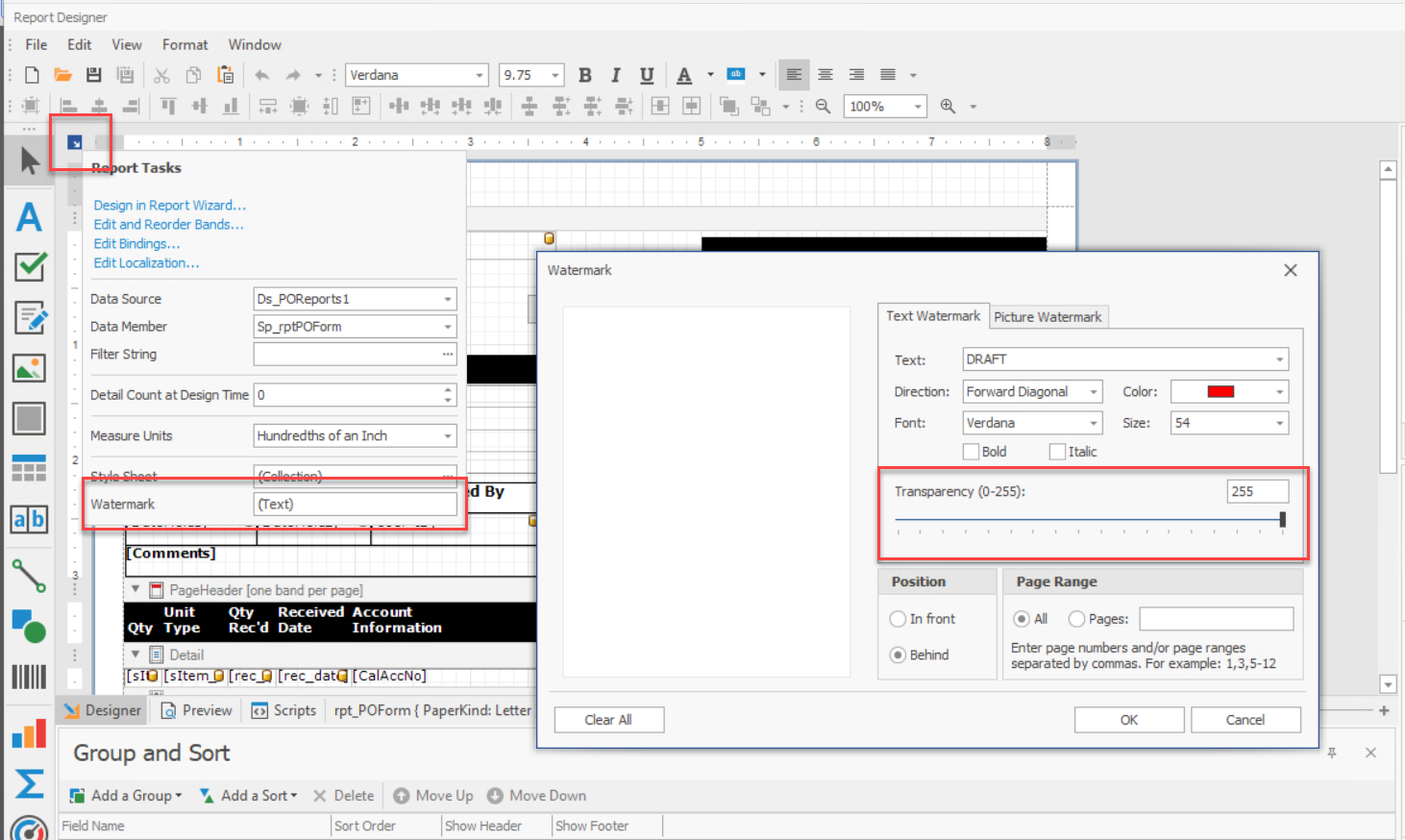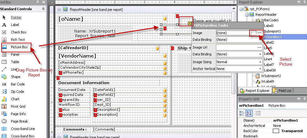 To add a logo to the form, use the picture box tool and drag it to the area on the form you would like to place it. You may have to re-arrange some of the fields to make the logo fit properly. Next, use the control tag to browse for the image and set the image sizing property (zoom).