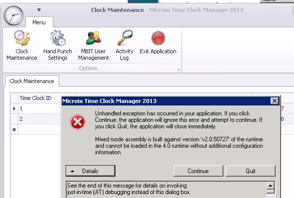 ISSUE: Mixed mode assembly error when using Microix Time Clock Manager application.