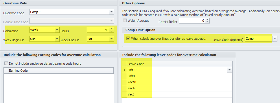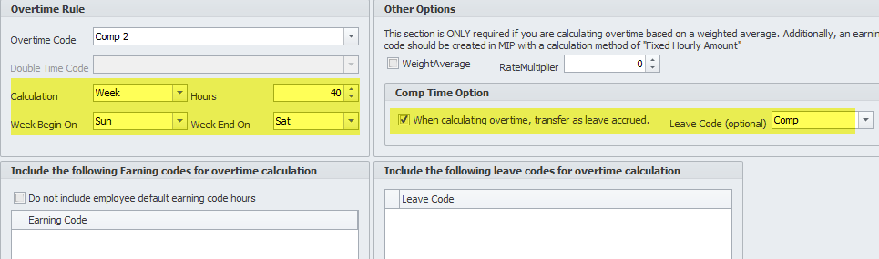 5. Setup Overtime rule in Microix for the first earning code called “Comp 1”. Since “Comp 1” hours will include both worked hours and leave hours, you must specify all the leave codes that should be included as part of the 40 hours worked. Check the option “When calculating overtime, transfer as leave accrued” and specify the leave code “Comp”