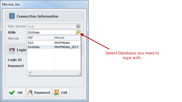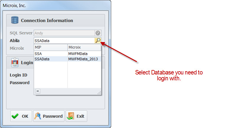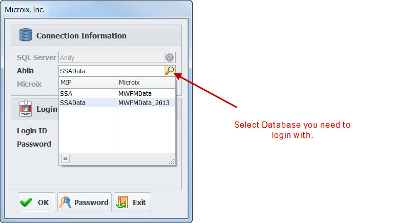 Step 3 : On the Login screen you can now select the database you need to login to.