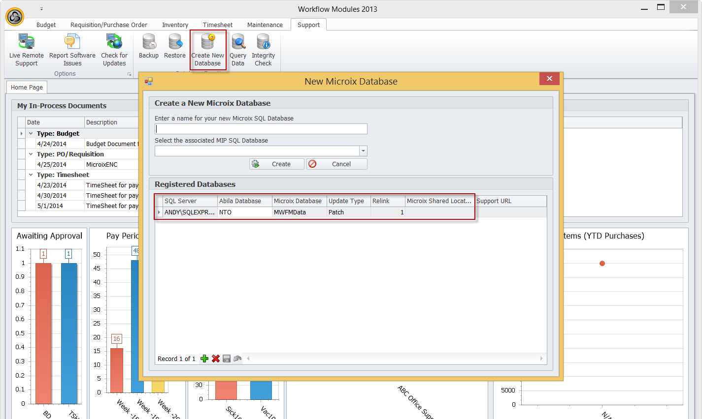 1. Navigate to Workflow Modules - Create New Database and verify you have correct Microix and MIP database linked. If not, then you can change it from Document Maintenance - Create New Database.