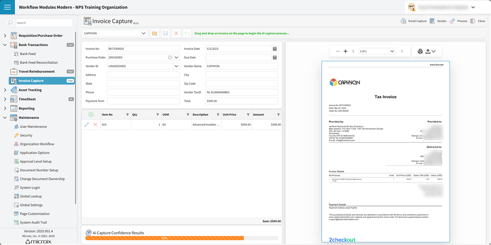The AI engine will OCR the document and populate values it found to match Microix Invoice fields.