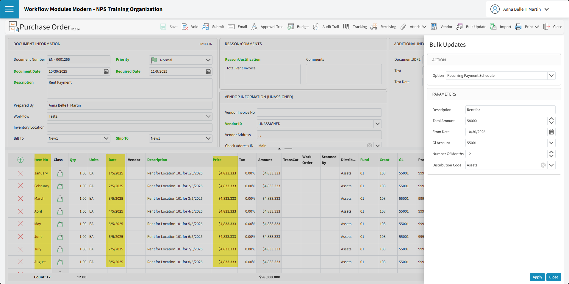 Terms: In the PO description, note "To be paid in 12 monthly installments of $1,000."