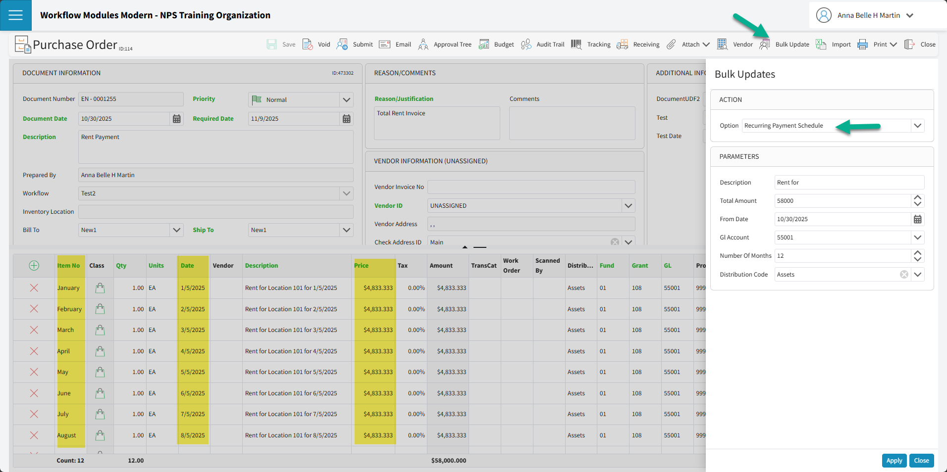 This advanced method leverages the "Recurring" functionality in a different way, creating a single "Standing Order" PO that manages the entire years' worth of payments in one document without the need to use encumbrance and allow Microix to obligate the total obligation against the budget.