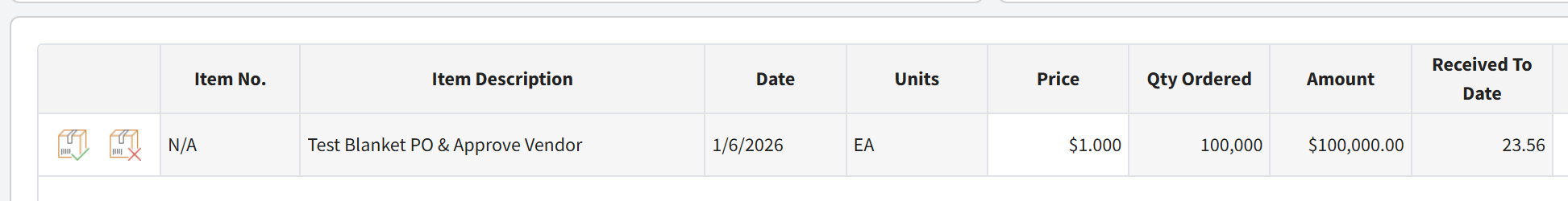 When receiving is enforced for purchase orders (GSID 43), receiving is performed by quantity by default. This means users cannot directly receive a specific dollar amount (such as $23) unless the purchase order is structured in a way that allows dollar-based receiving.