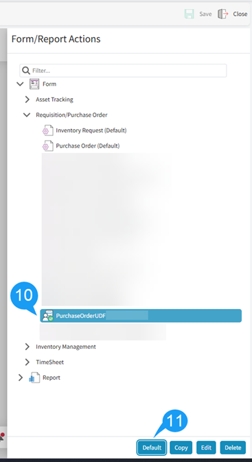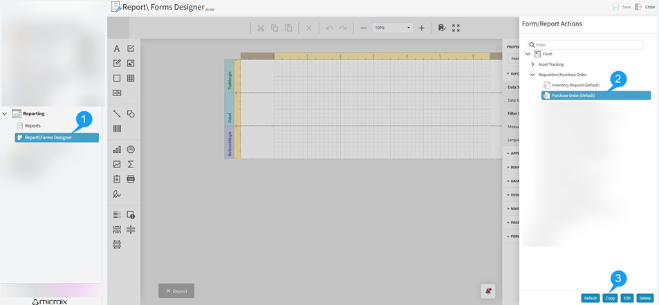 Select the predefined form you want to customize (for example, Purchase Order (Default)). At the bottom of the panel, click Copy to create a new editable version before making any changes.