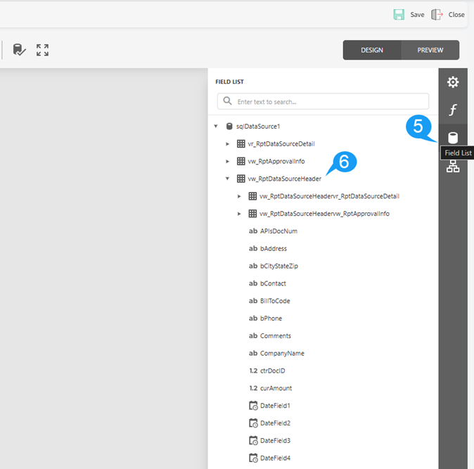 Field not visible in Field List: Confirm the field exists in the report dataset or database view and that the correct dataset (header vs. detail) is expanded.